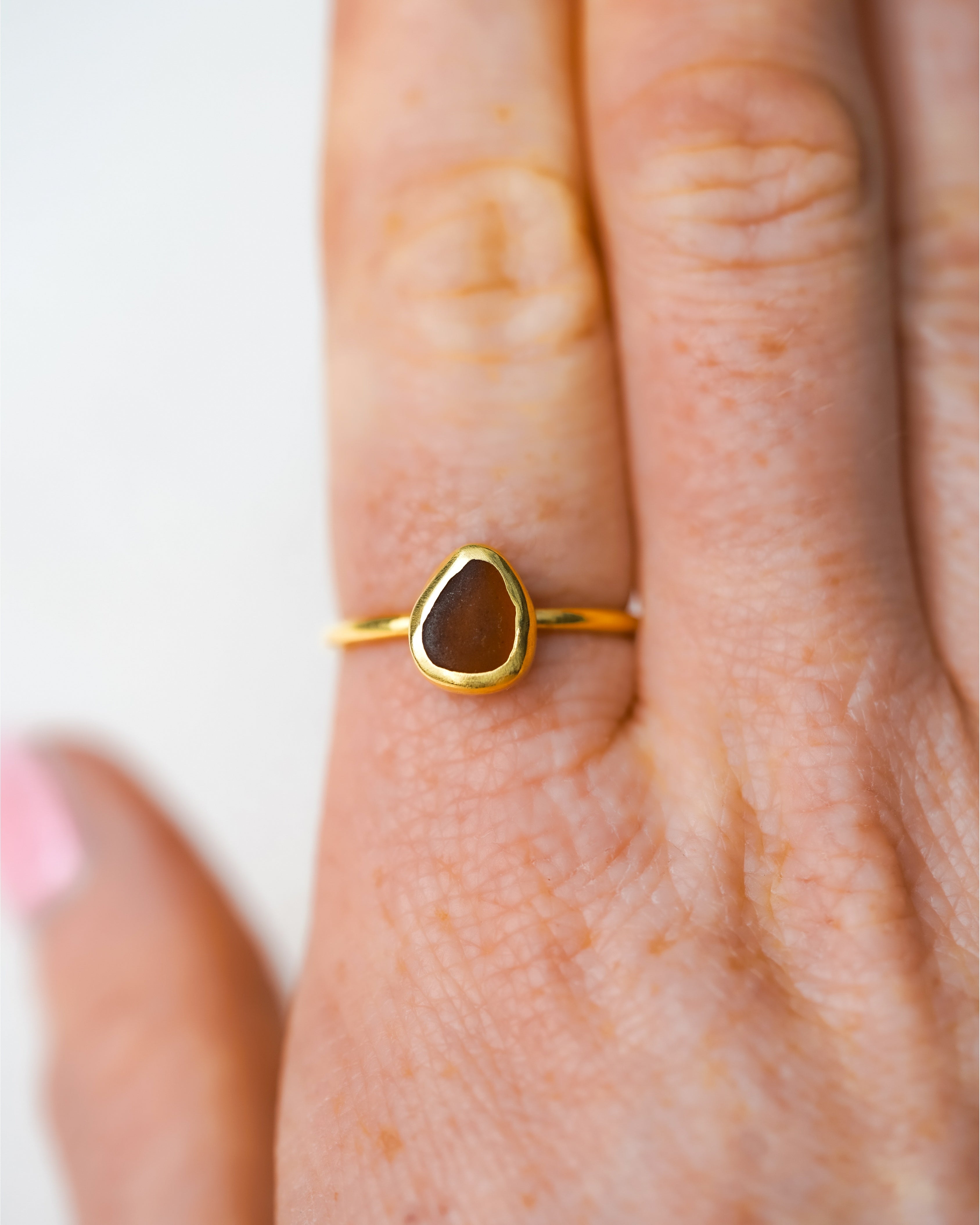 Amber Sea Glass Ring - Handmade from 925 Sterling Silver plated with a 10 micron thick and hard layer of 24K (Gold Vermeil)