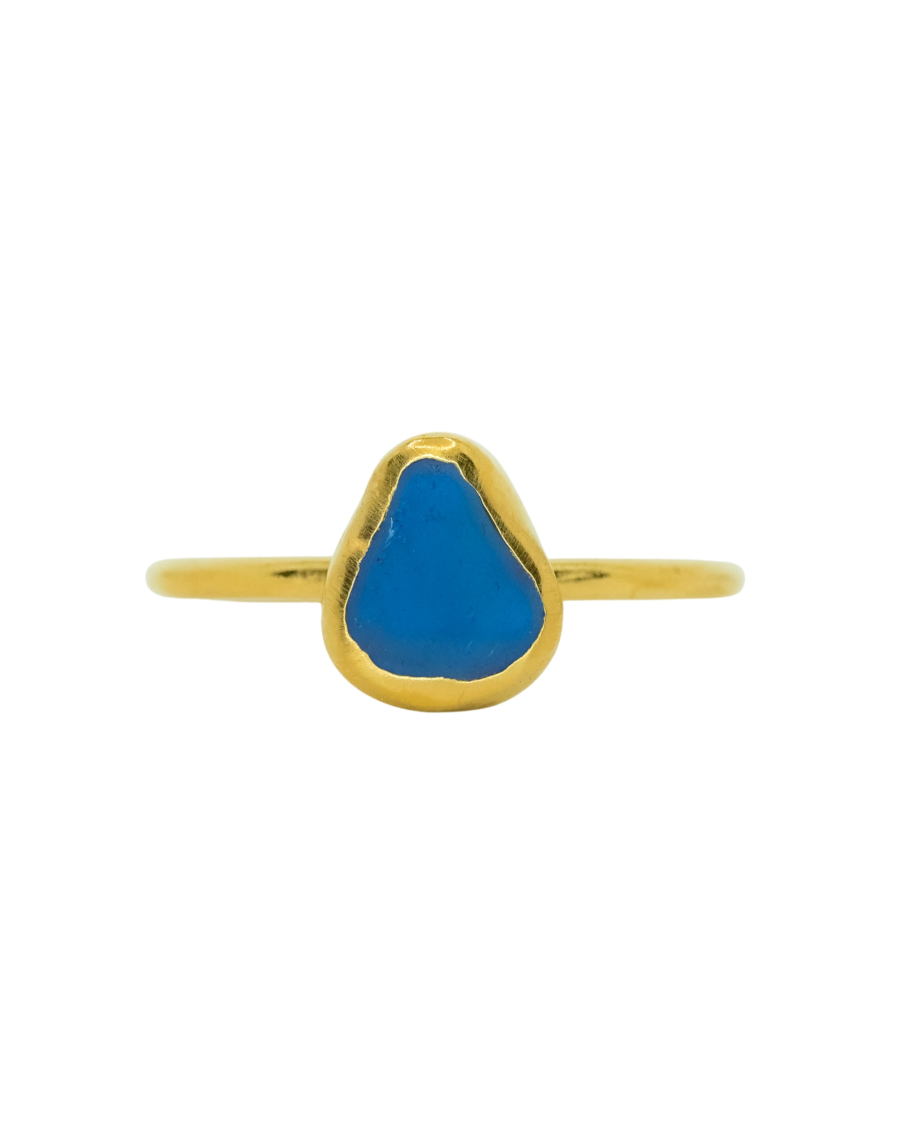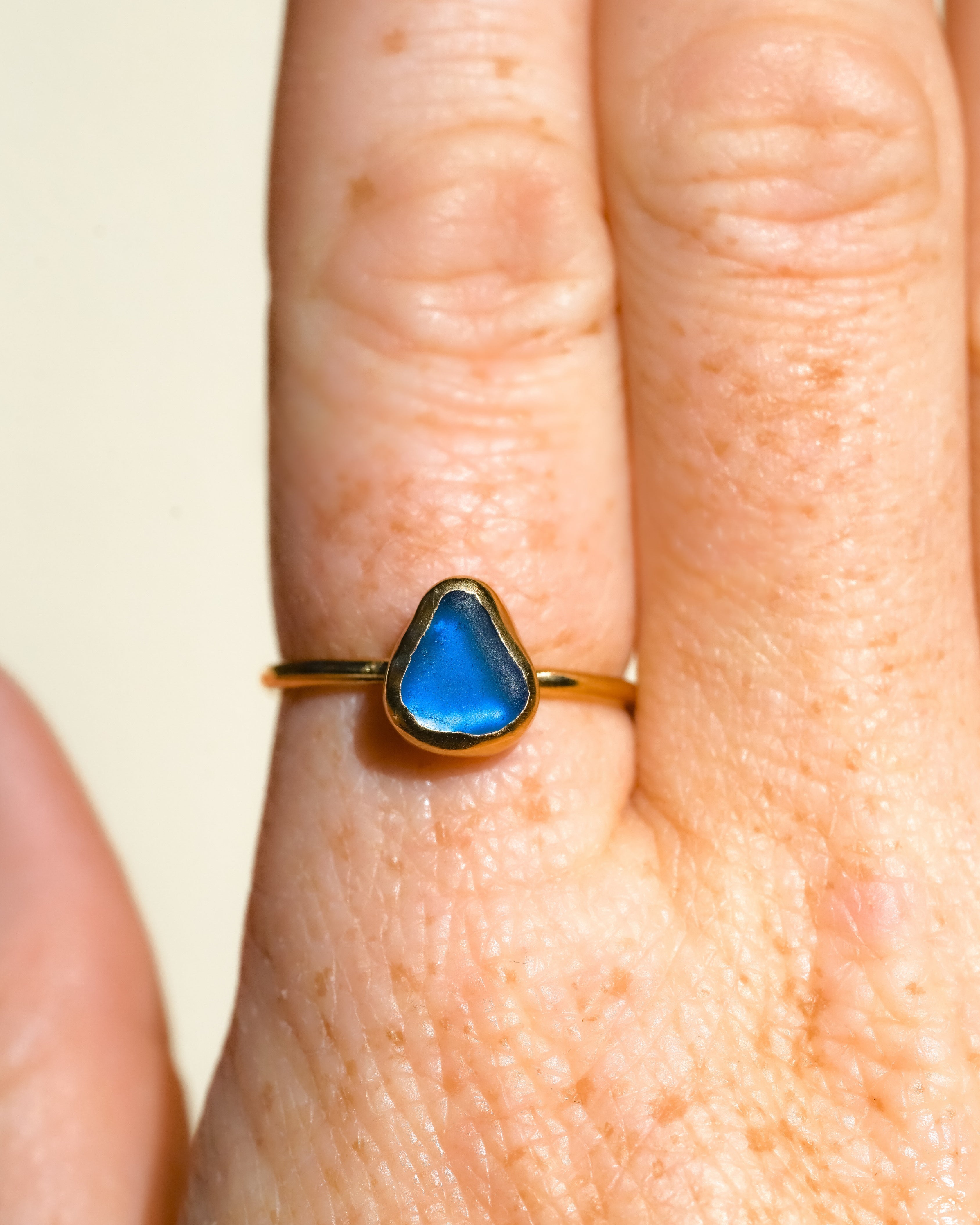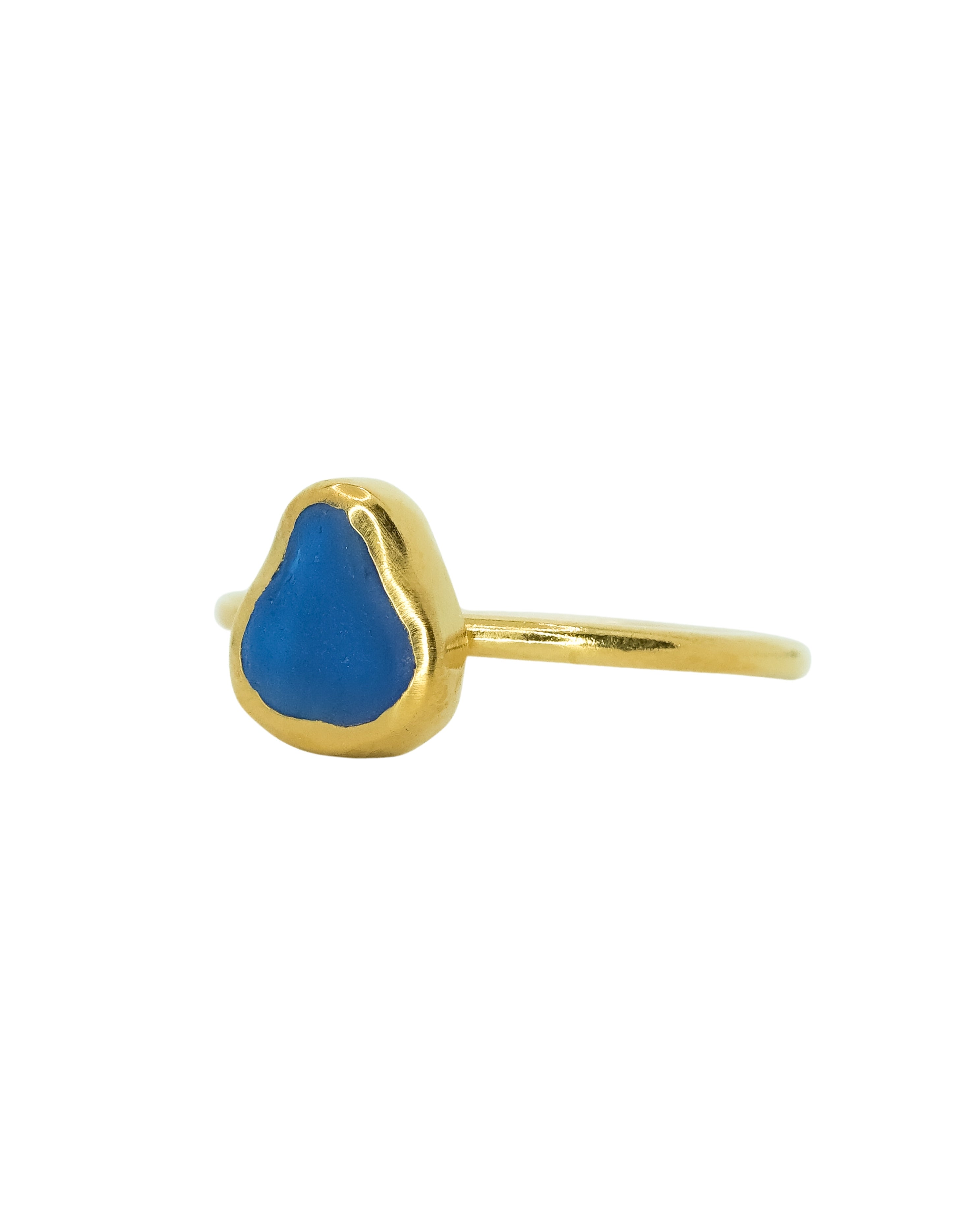 Blue Sea Glass Ring - Handmade from 925 Sterling Silver plated with a 10 micron thick and hard layer of 24K (Gold Vermeil)