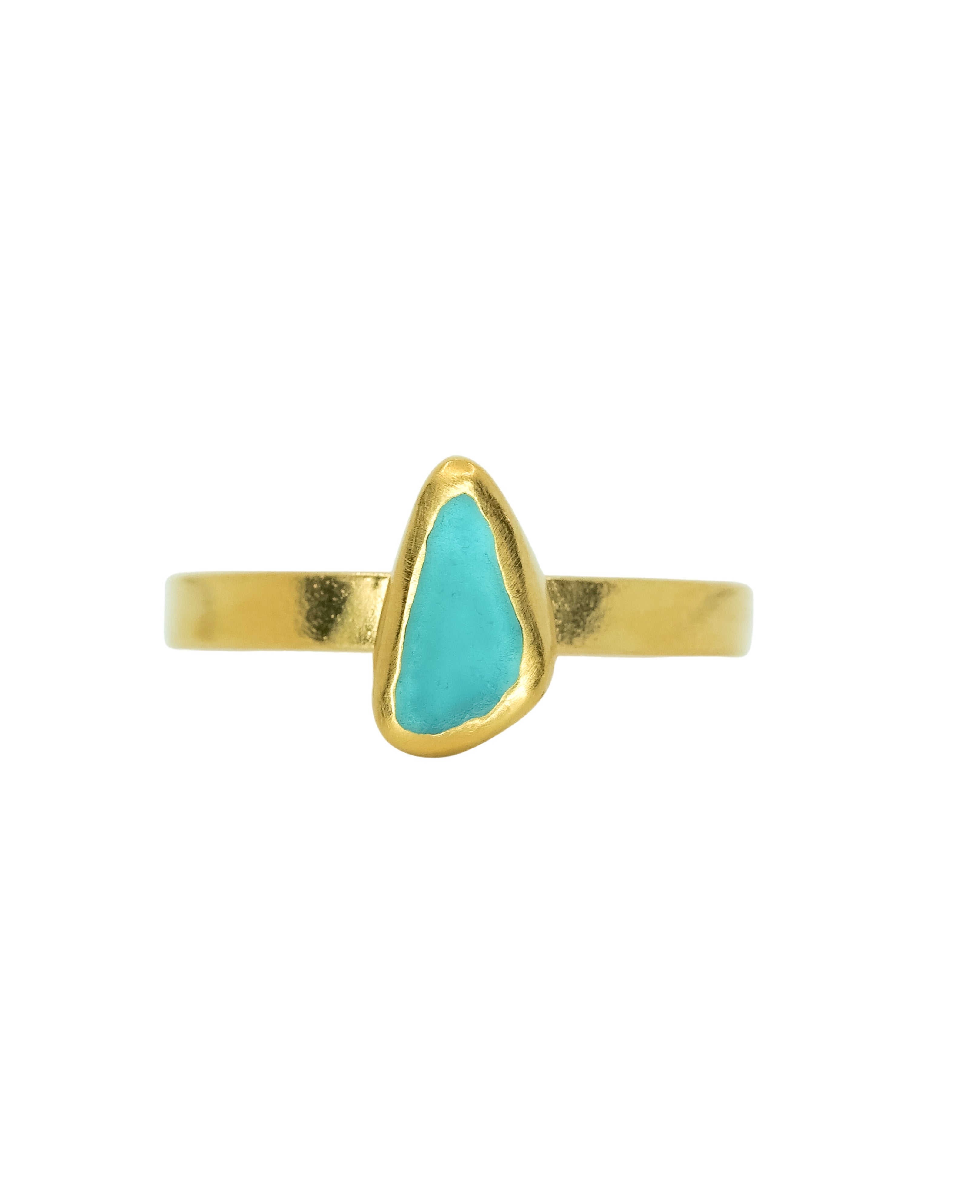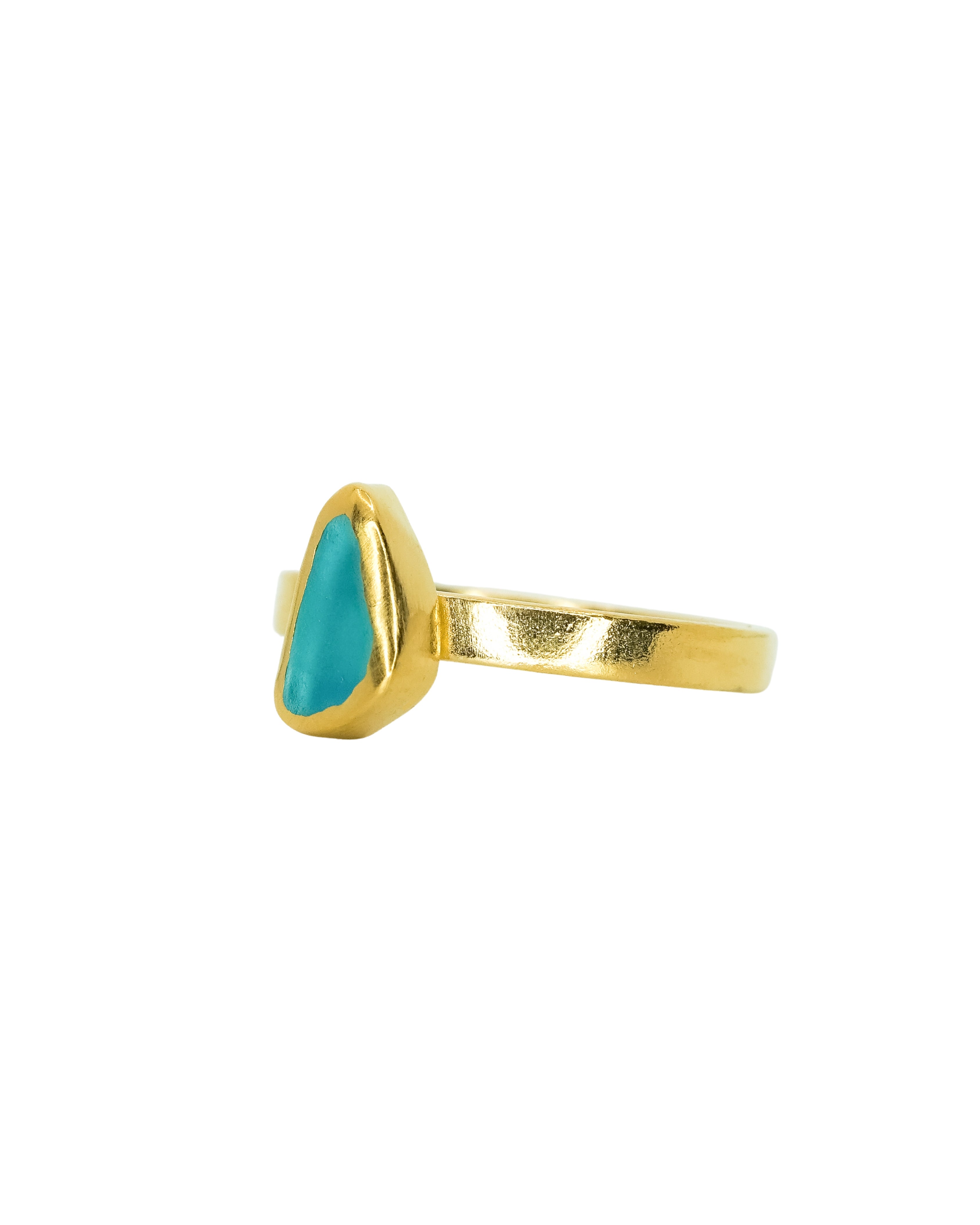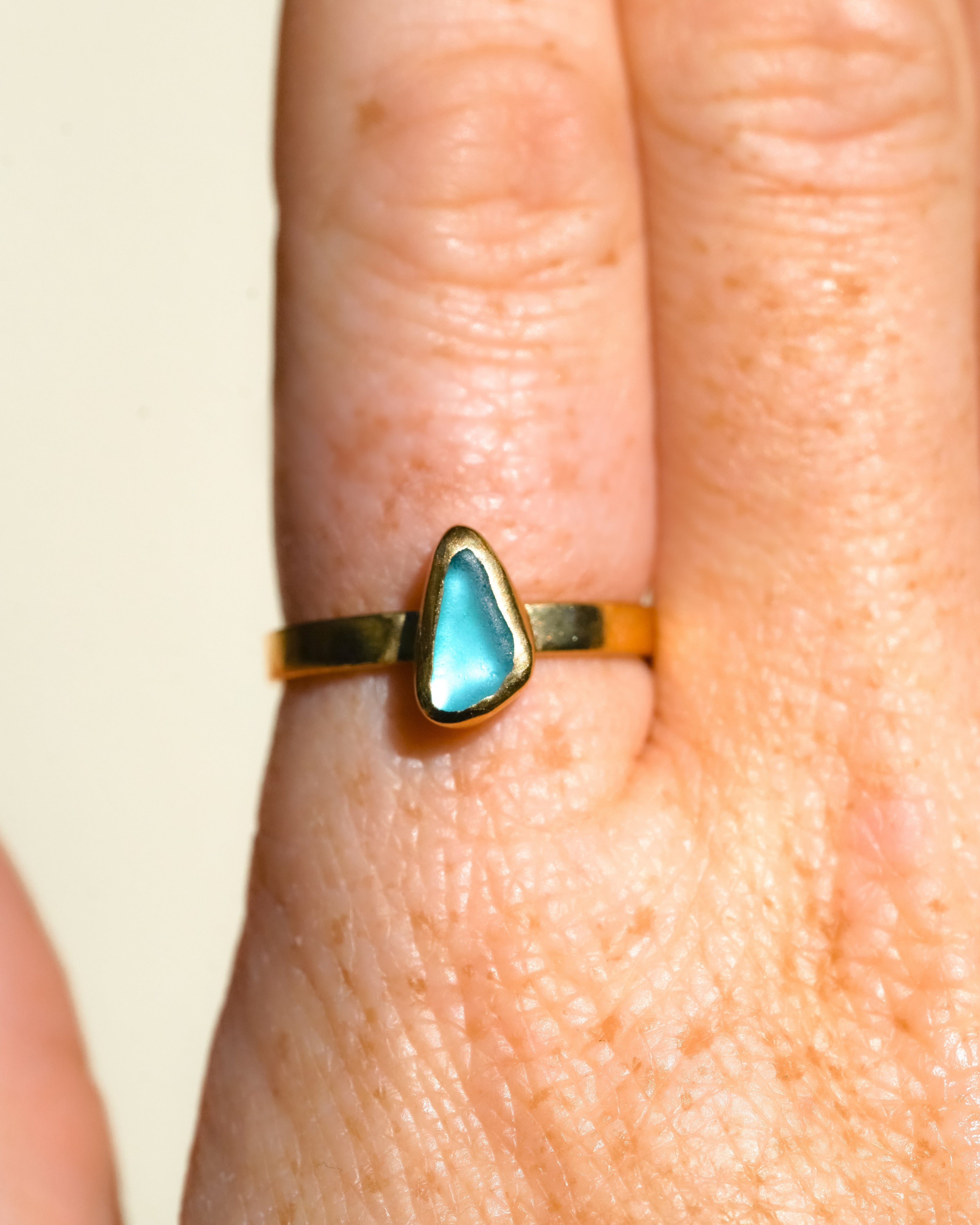 Blue Sea Glass Ring - Handmade from 925 Sterling Silver plated with a 10 micron thick and hard layer of 24K (Gold Vermeil)