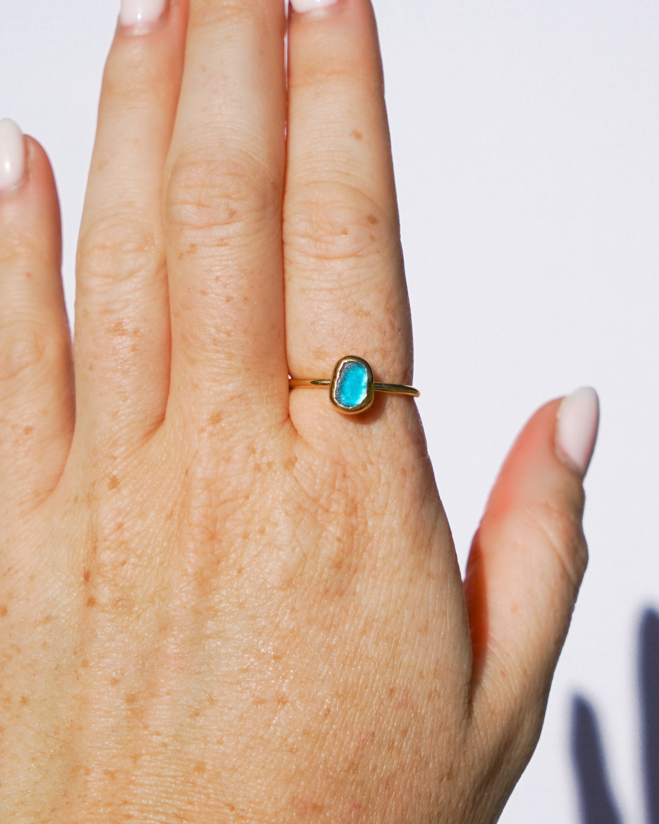 Blue Sea Glass Ring - Handmade from 925 Sterling Silver plated with a 10 micron thick and hard layer of 24K (Gold Vermeil)