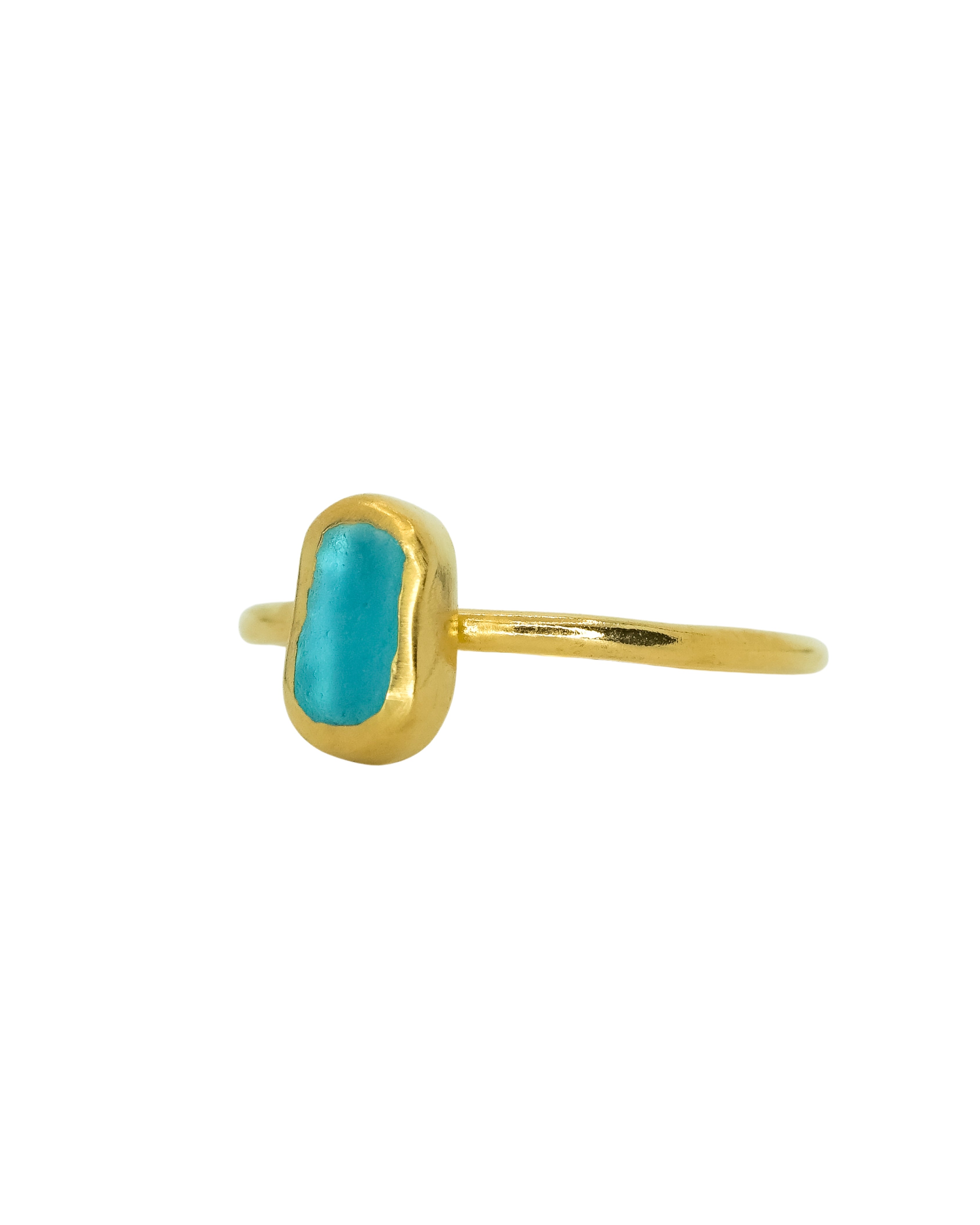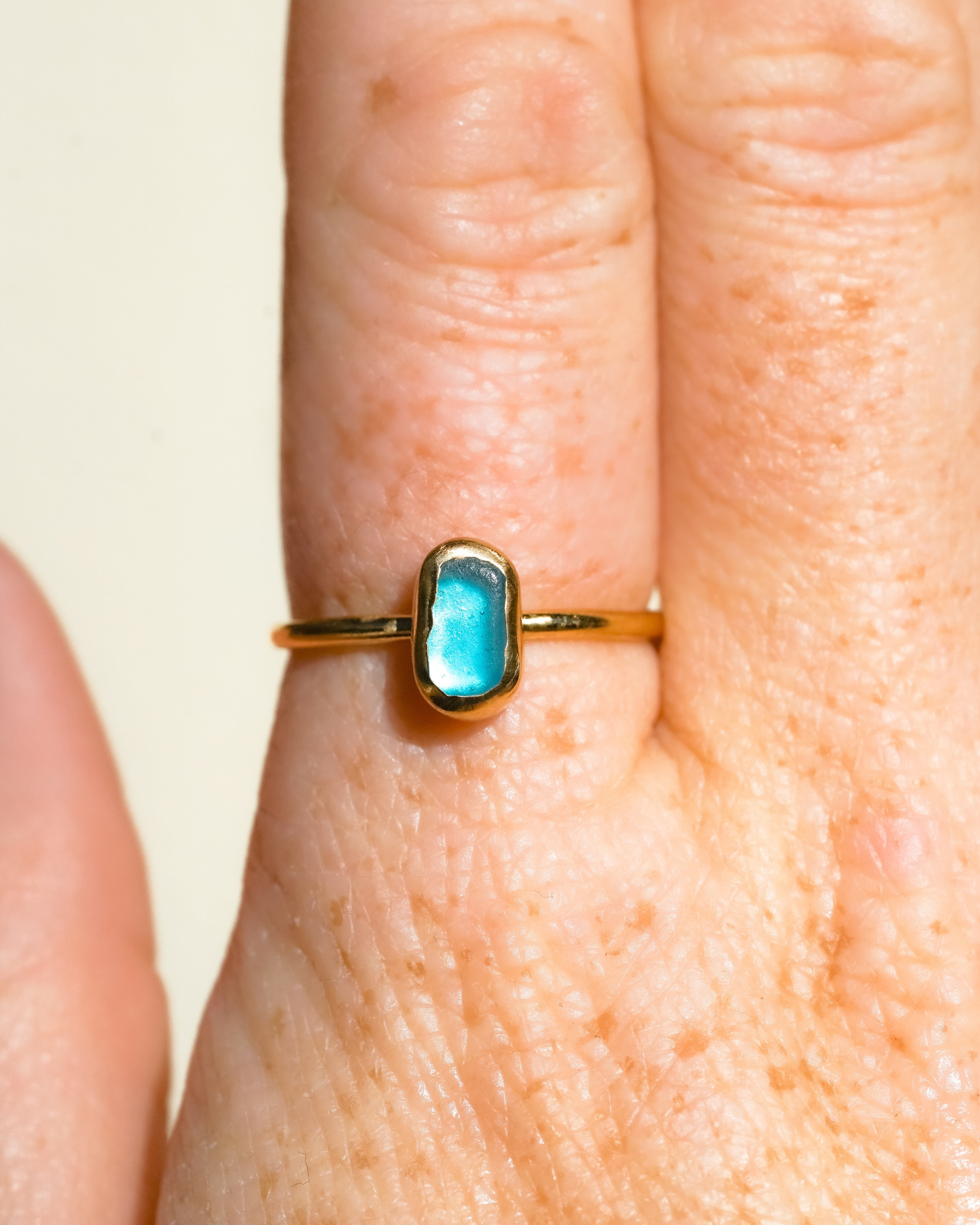 Blue Sea Glass Ring - Handmade from 925 Sterling Silver plated with a 10 micron thick and hard layer of 24K (Gold Vermeil)