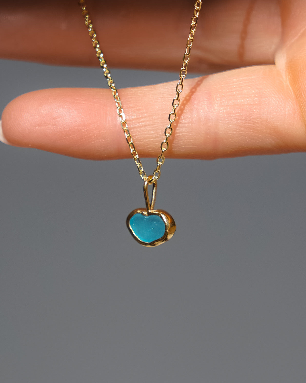 Our new open back design! This necklace has been designed with an open back which means the metal has been placed just around the glass, not behind (making them waterproof). This allows light to shine though the glass showing its true colours 🤍