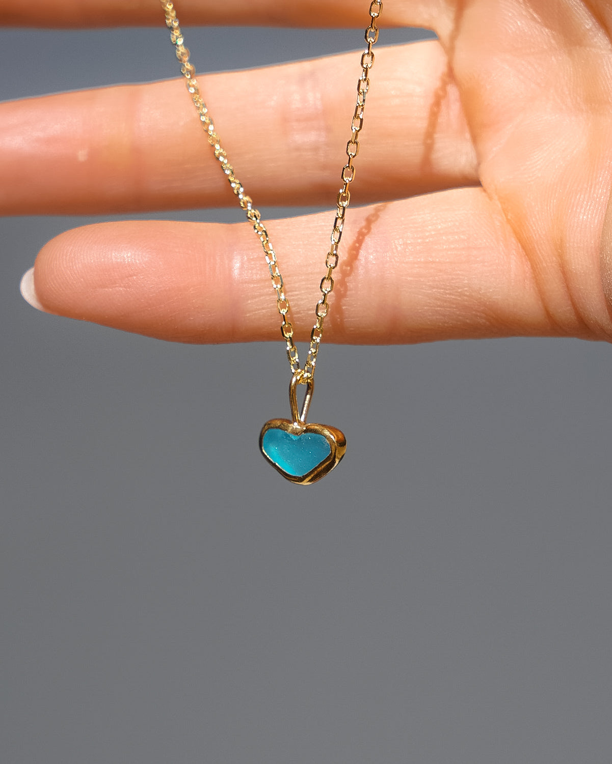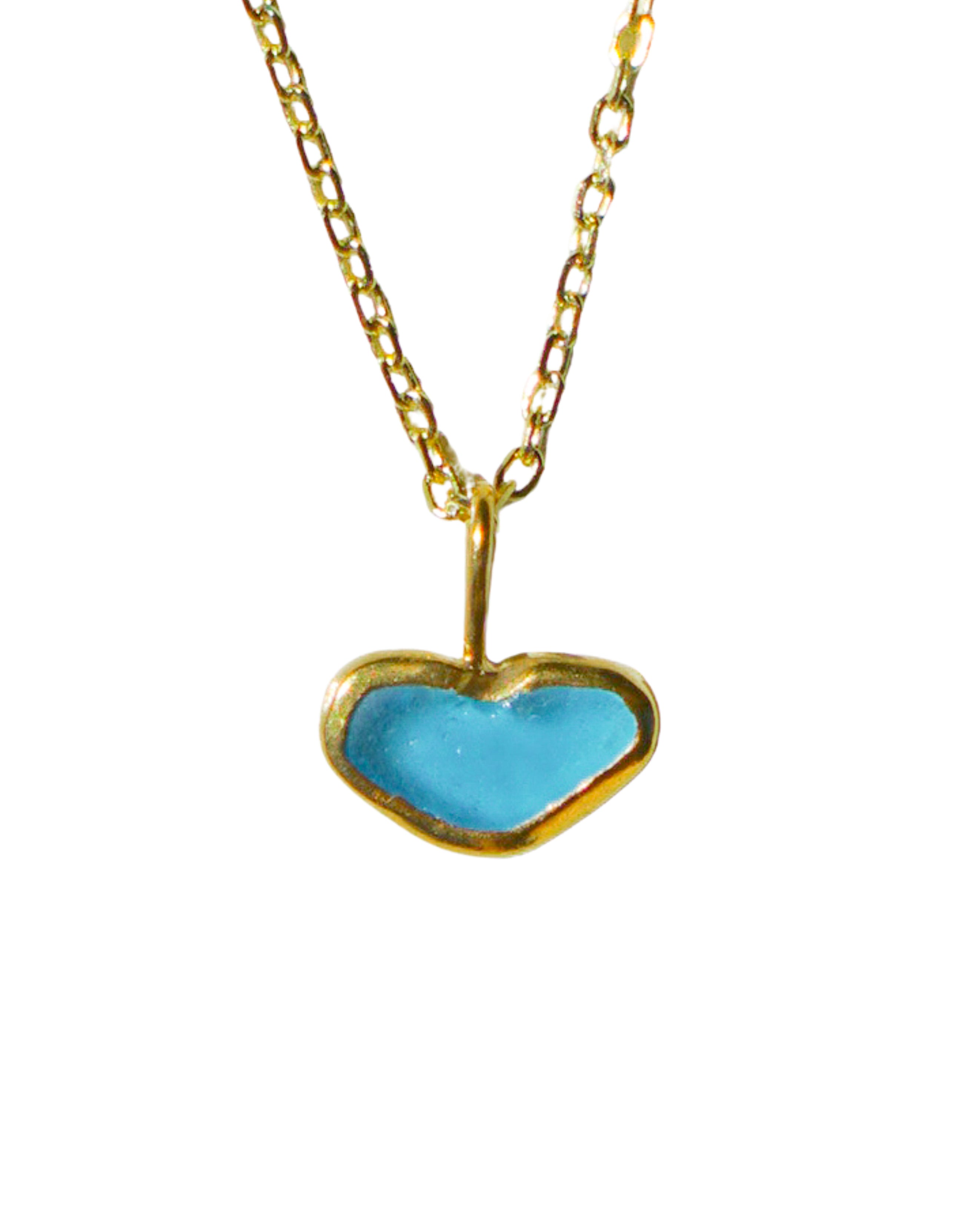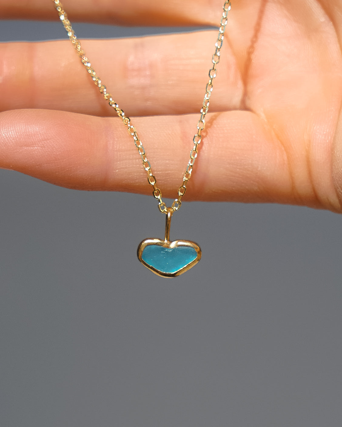 Blue Sea Glass Heart Necklace, Gold Vermeil
