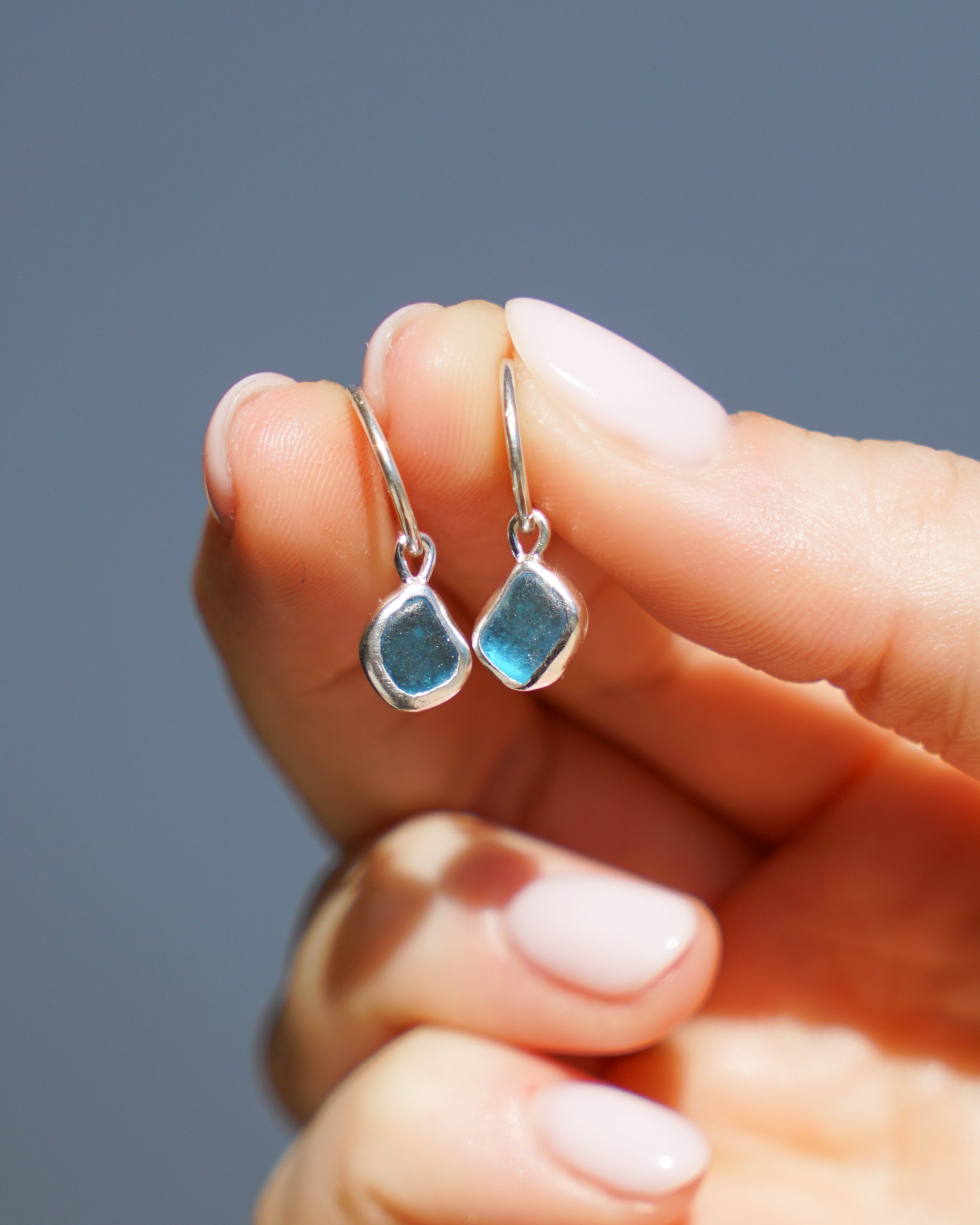 Each piece is handcrafted with genuine sea glass and precious metals. To keep your pieces looking their best, we recommend removing them before swimming, showering, or applying lotions and perfumes, and storing them in a dry place when not being worn.