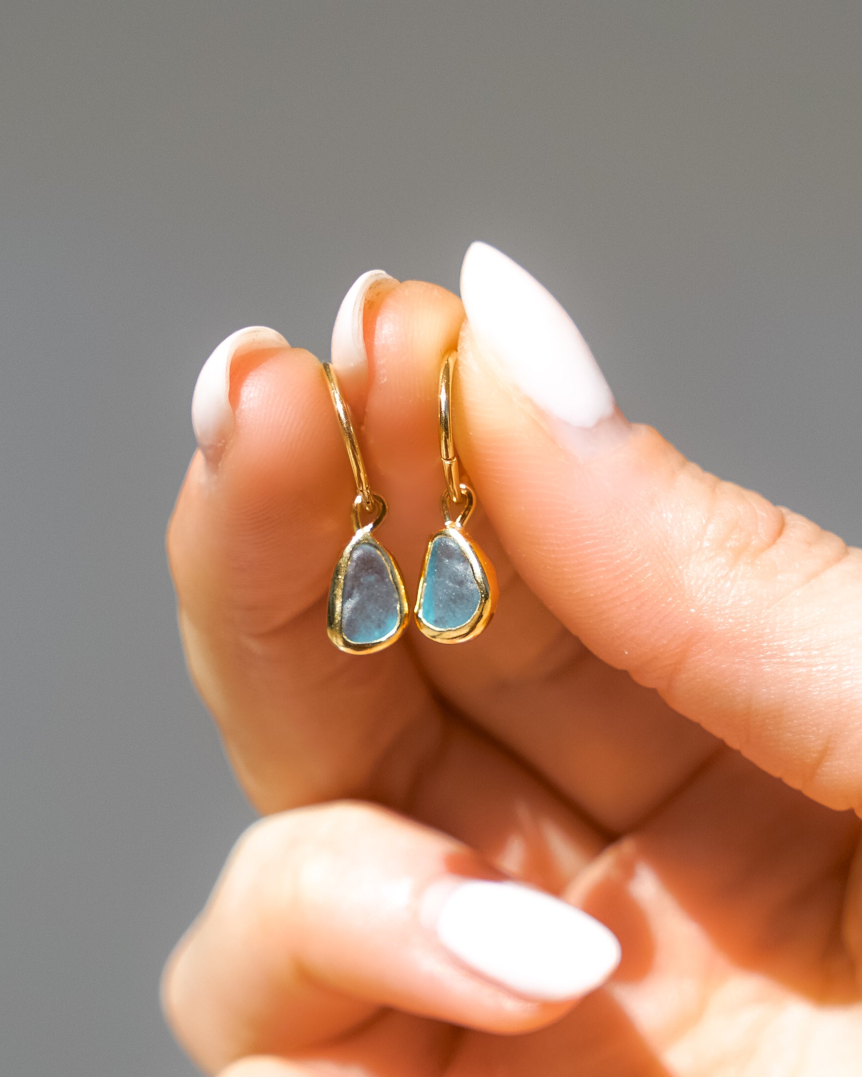 Our new open back design! These earrings have been designed with an open back which means the metal has been placed just around the glass, not behind (making them waterproof). This allows light to shine though the glass showing its true colours 🤍