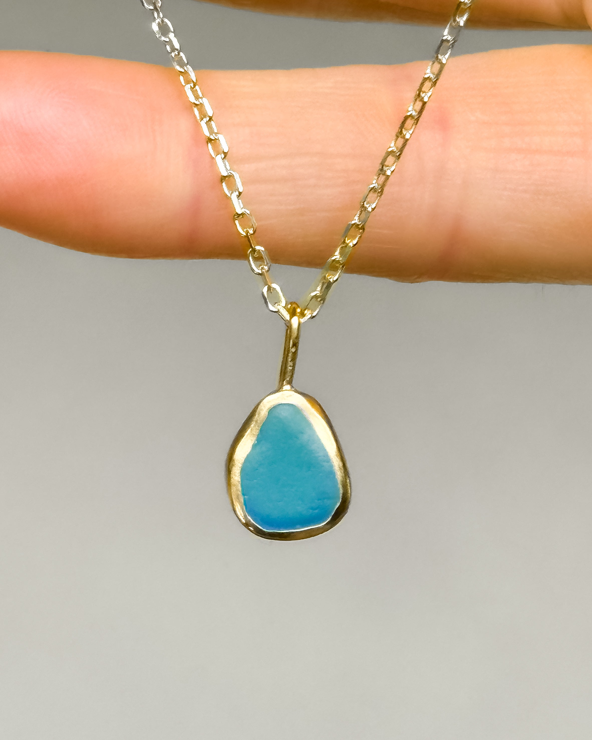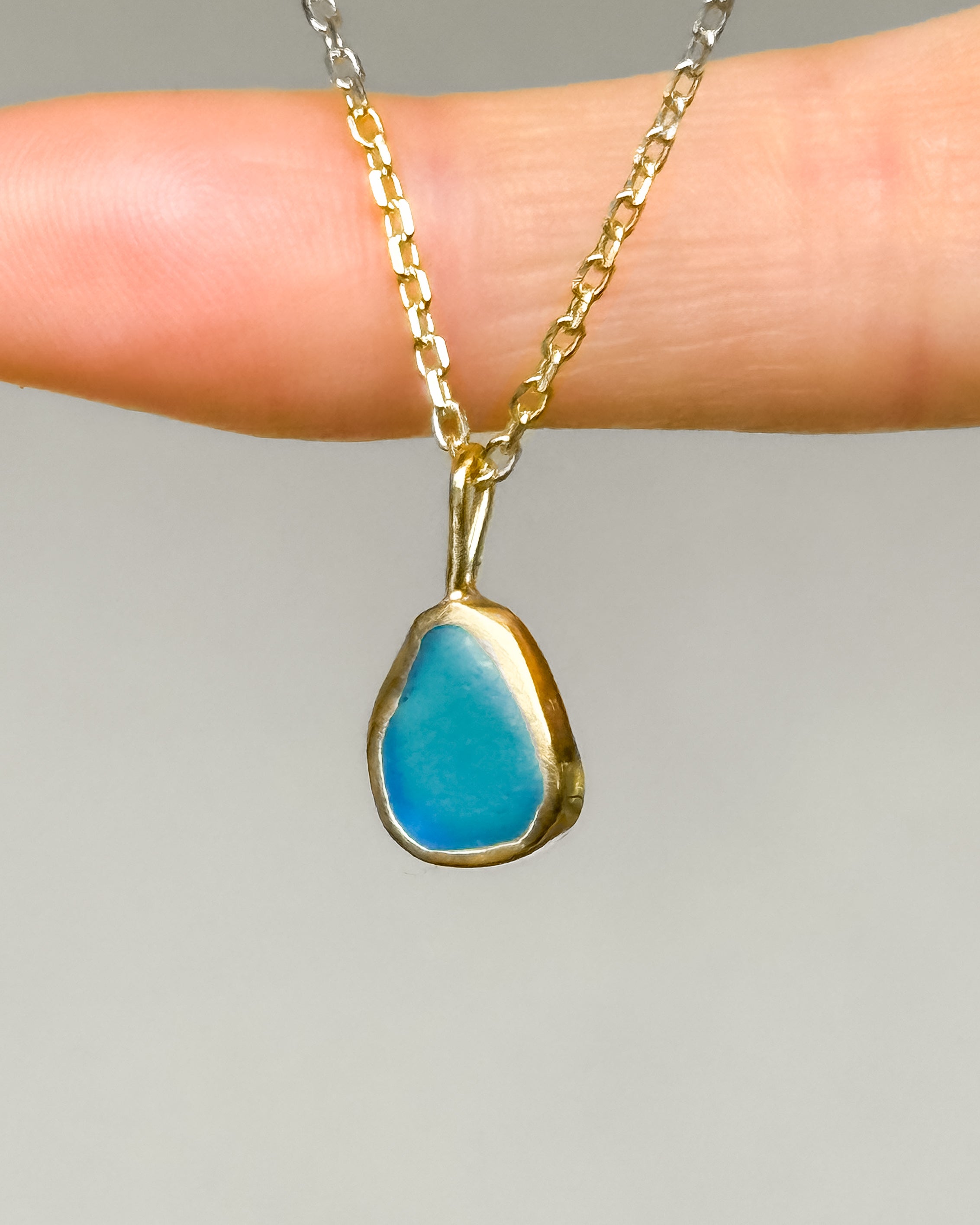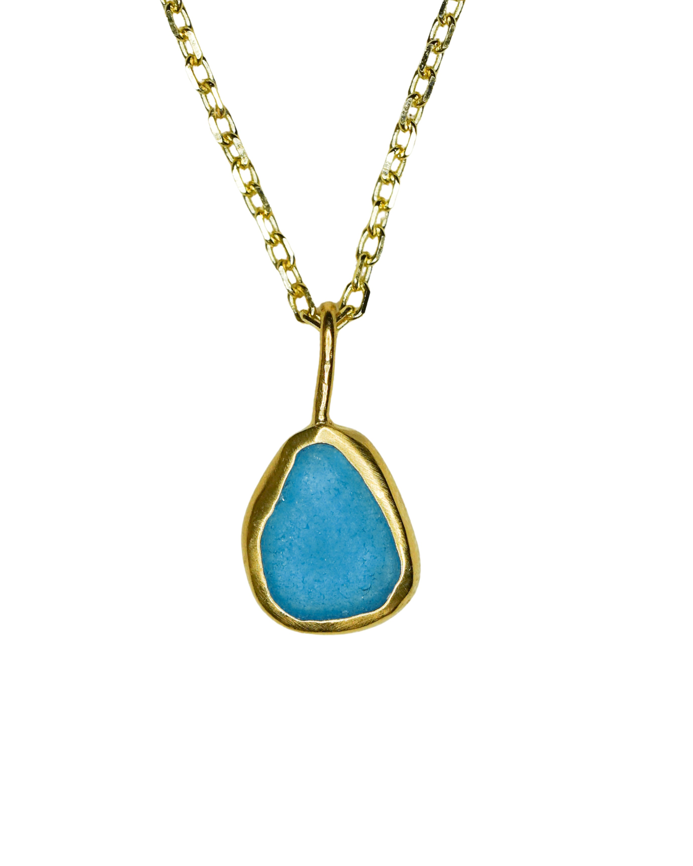 Blue Sea Glass Necklace - Handmade from 925 Sterling Silver plated with a 10 micron thick and hard layer of 24K (Gold Vermeil)