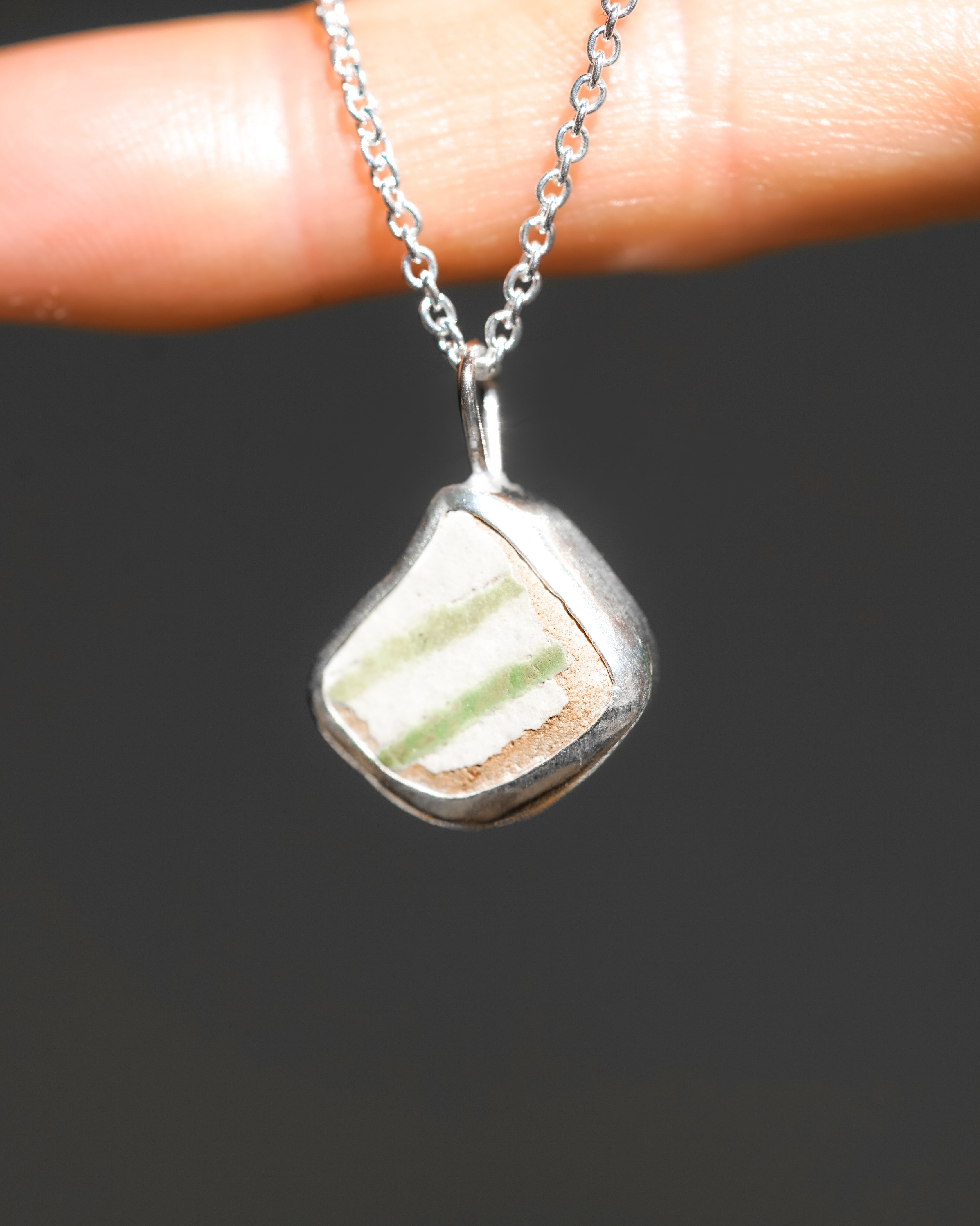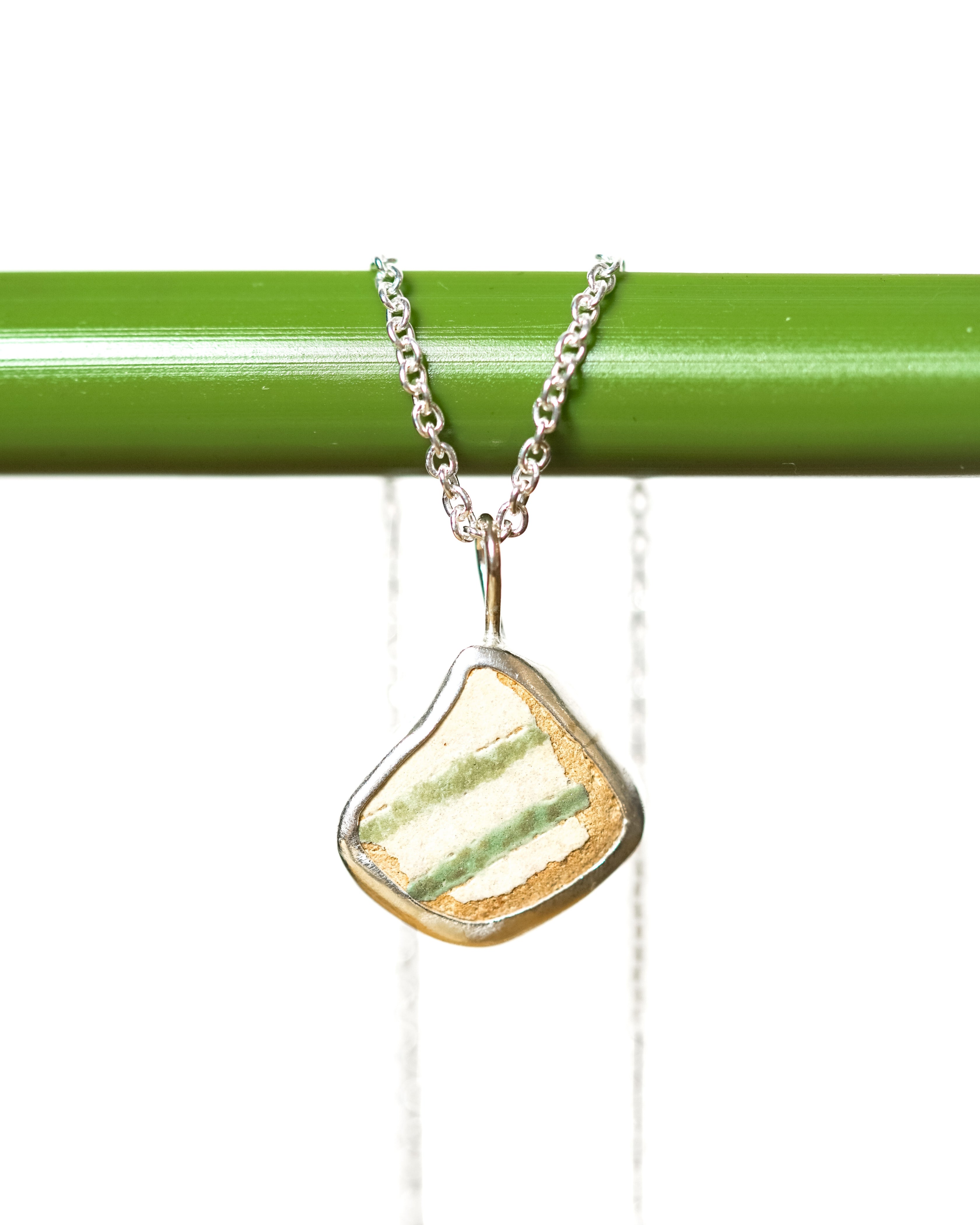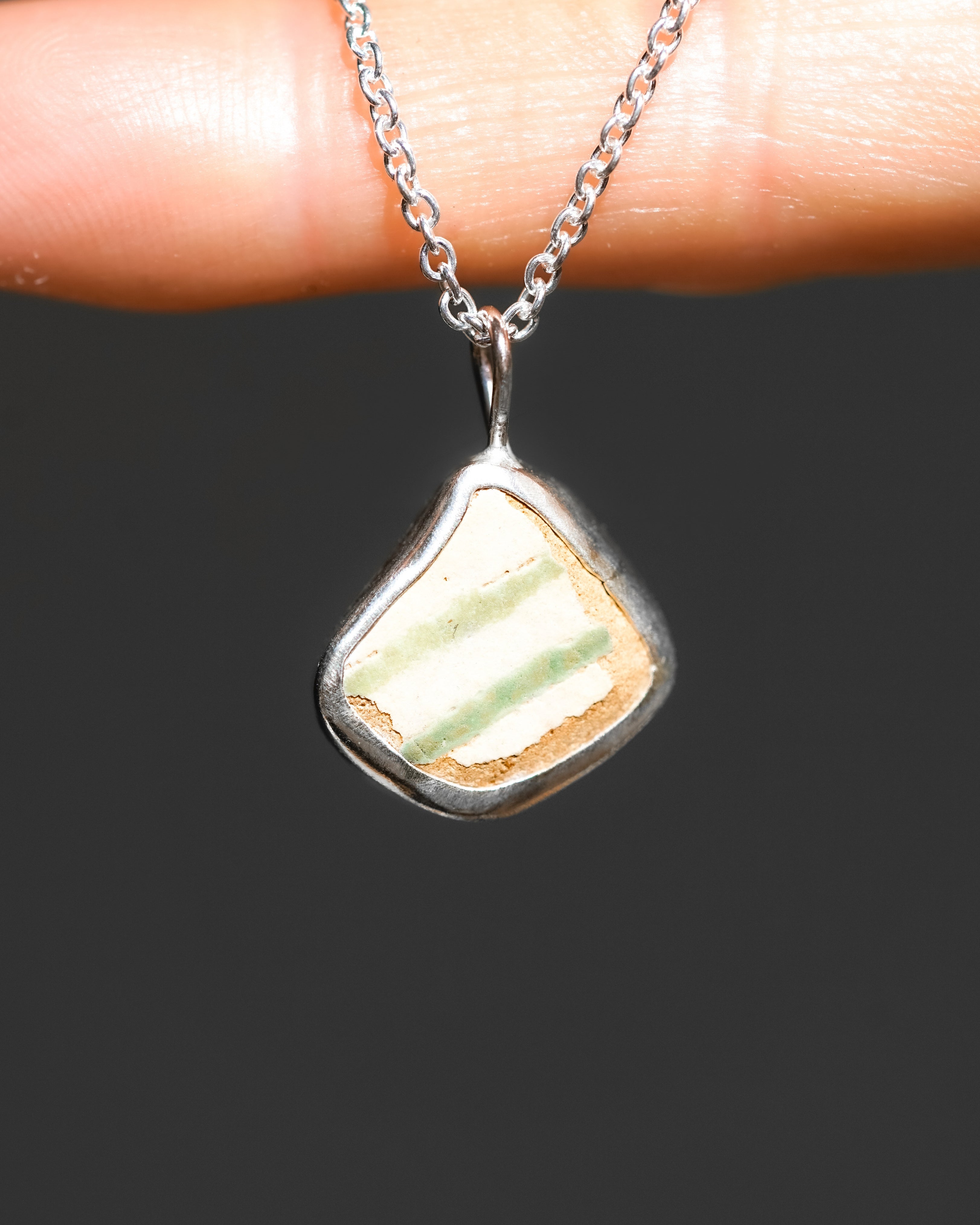 This necklace has been made from a fragment of ceramic that was found along the beaches here in South Australia. It has been carefully encased, preserving its charm and beauty.