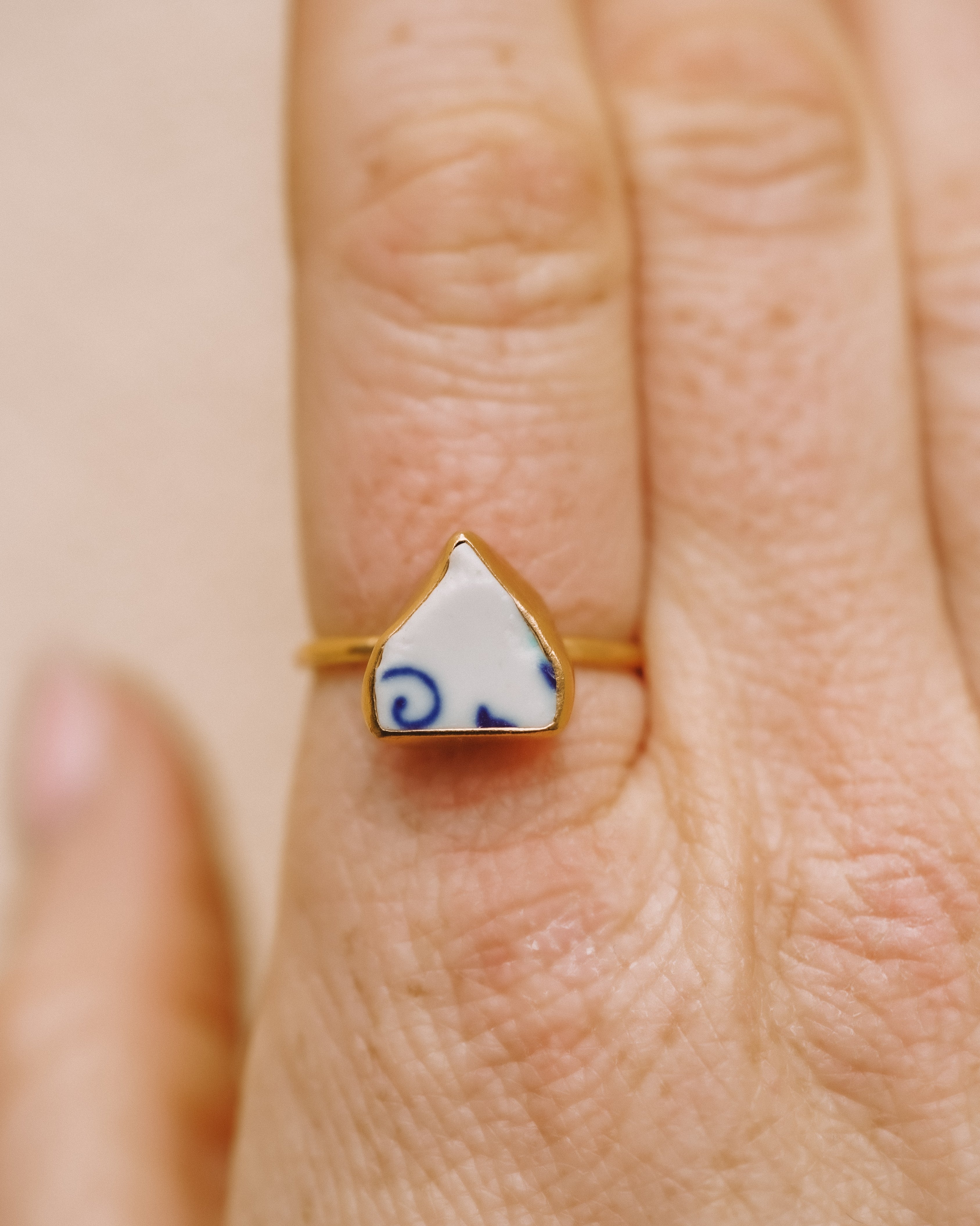 This ring has been made from a fragment of ceramic that was found in the Flinders Ranges here in South Australia. It has been carefully encased, preserving its charm and beauty. Each piece tells a unique story, combining history and craftsmanship, making it a cherished accessory to be worn and admired for lifetimes to come 🤍