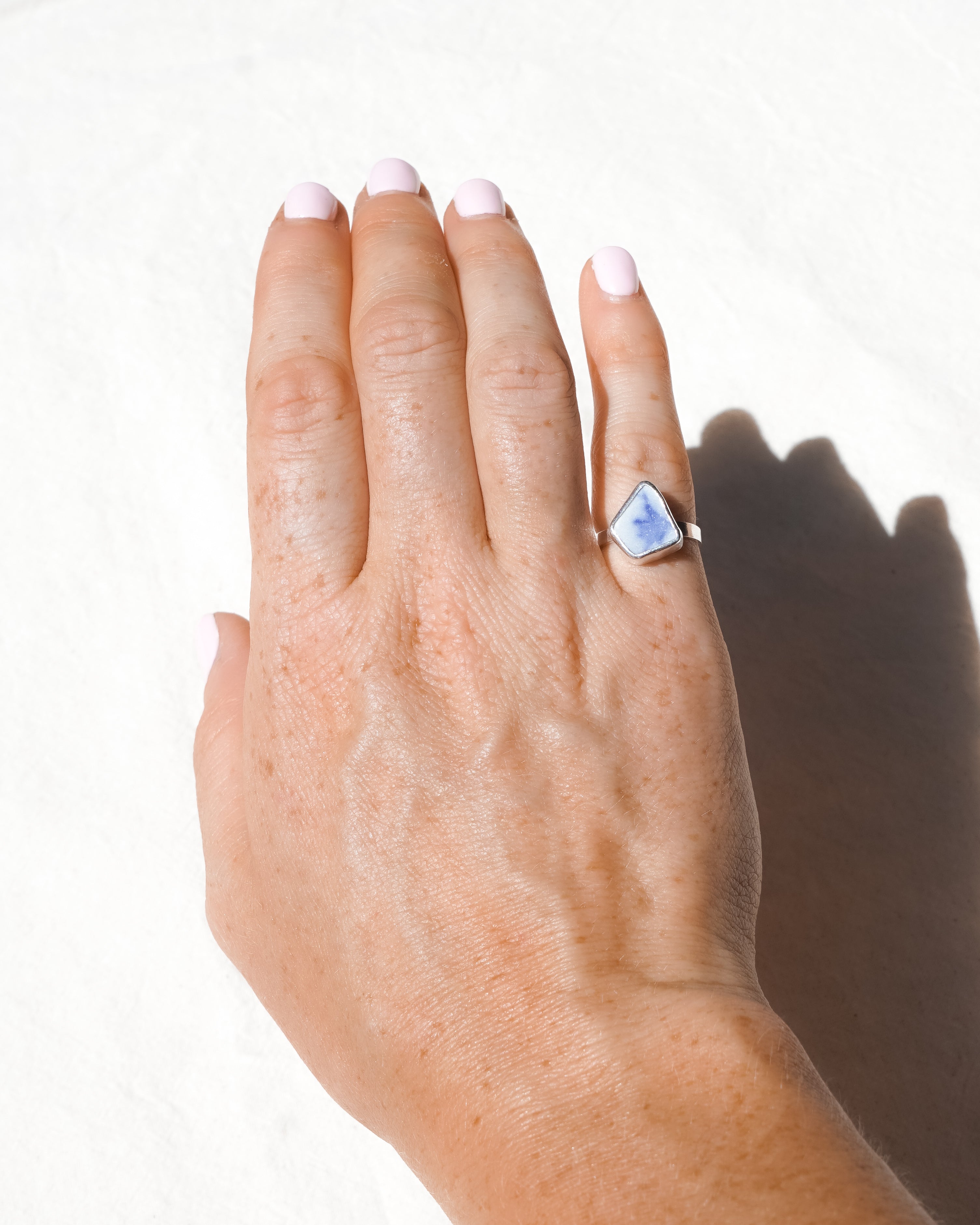 This ring has been made from a fragment of ceramic that was found in the Flinders Ranges here in South Australia. It has been carefully encased, preserving its charm and beauty. Each piece tells a unique story, combining history and craftsmanship, making it a cherished accessory to be worn and admired for lifetimes to come.