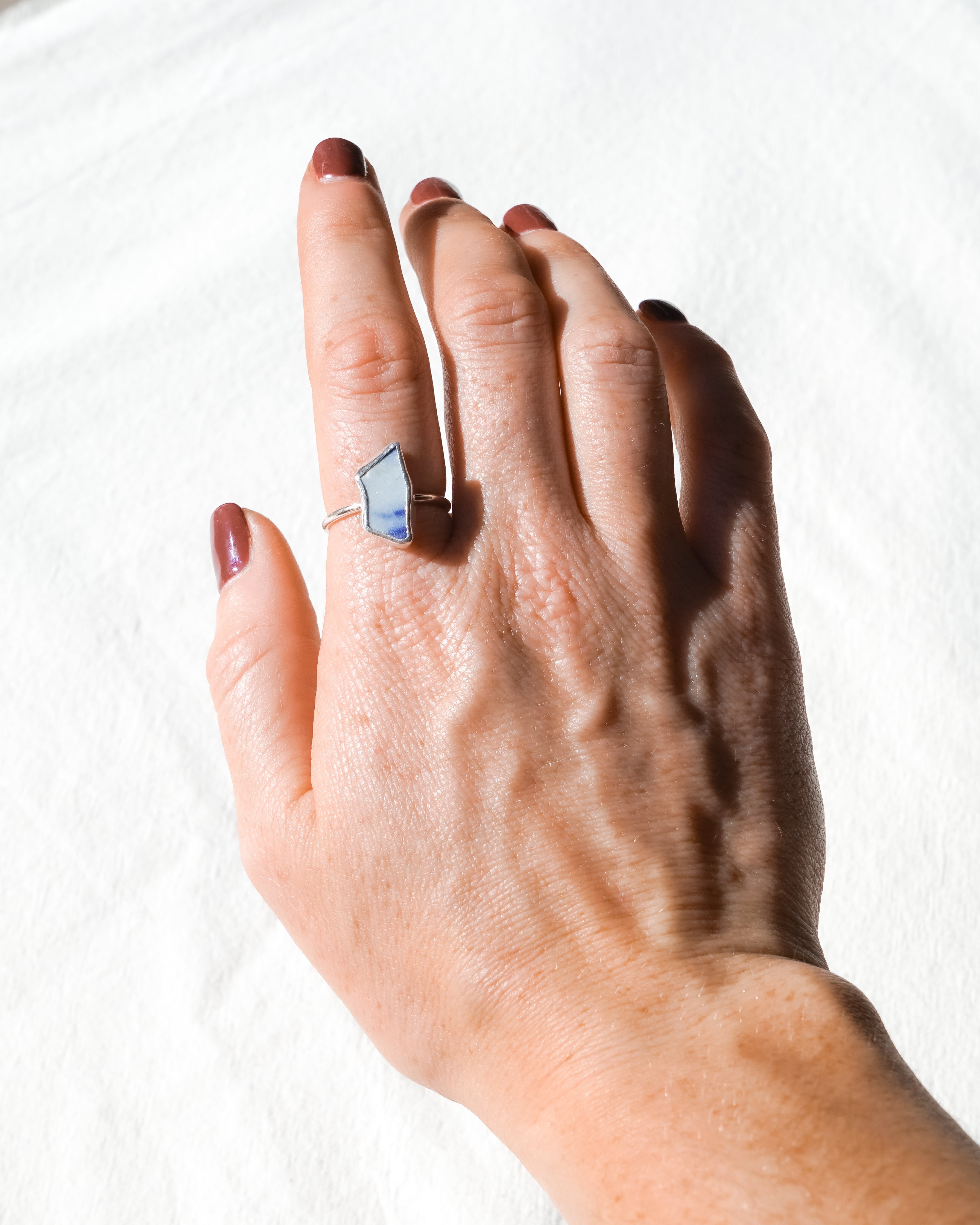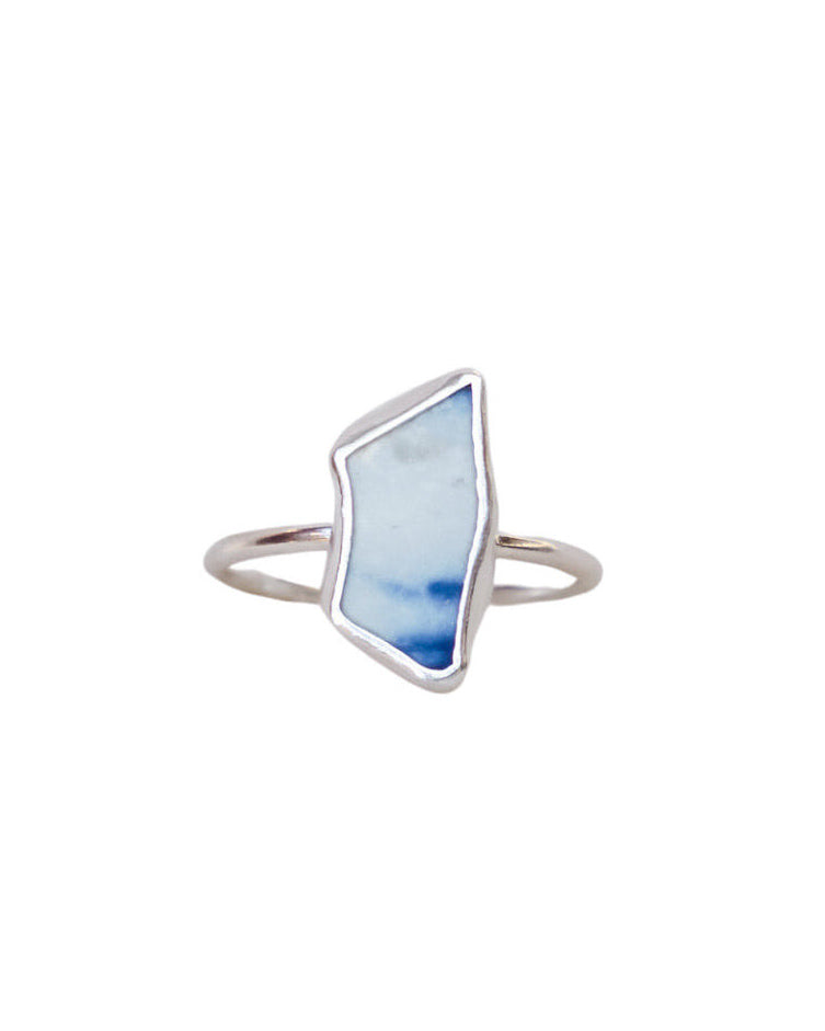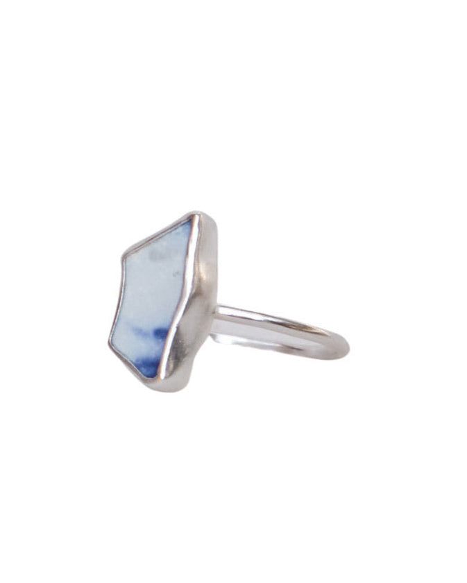 This ring has been made from a fragment of ceramic that was found in the Flinders Ranges here in South Australia. It has been carefully encased, preserving its charm and beauty. Each piece tells a unique story, combining history and craftsmanship, making it a cherished accessory to be worn and admired for lifetimes to come.