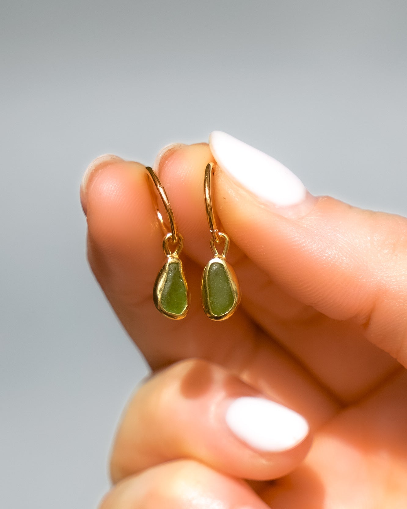 Each piece is handcrafted with genuine sea glass and precious metals. To keep your pieces looking their best, we recommend removing them before swimming, showering, or applying lotions and perfumes, and storing them in a dry place when not being worn.