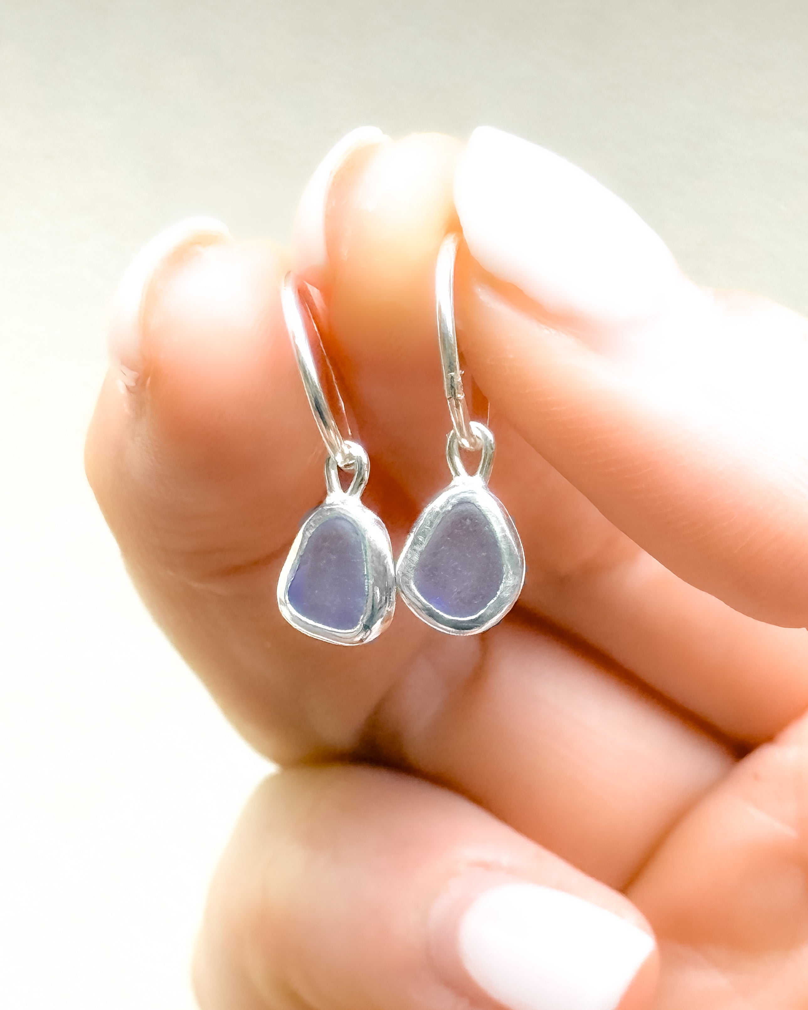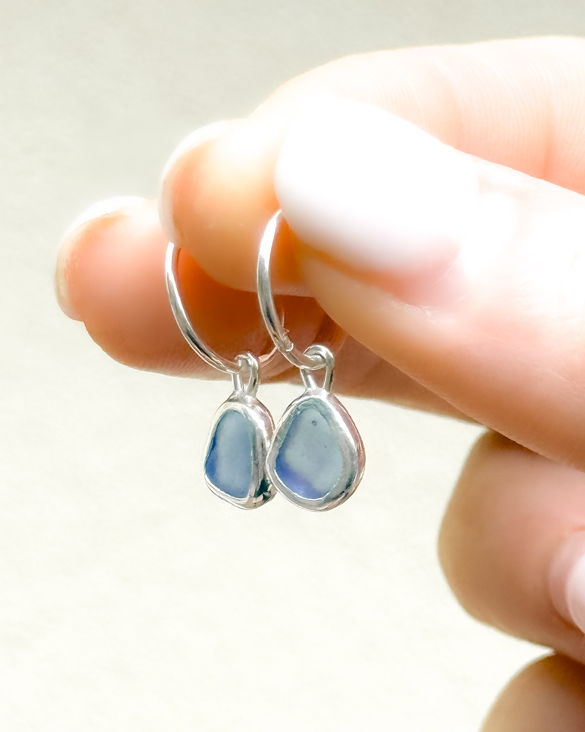 Sea Glass Jewellery (Closed Back Designs) - Closed back sea glass pieces should be kept out of water whenever possible. As the glass is transparent, moisture may affect the colouring due to the silver underneath, mainly the lighter shades. To help preserve their beauty, we recommend removing them before showering or swimming.