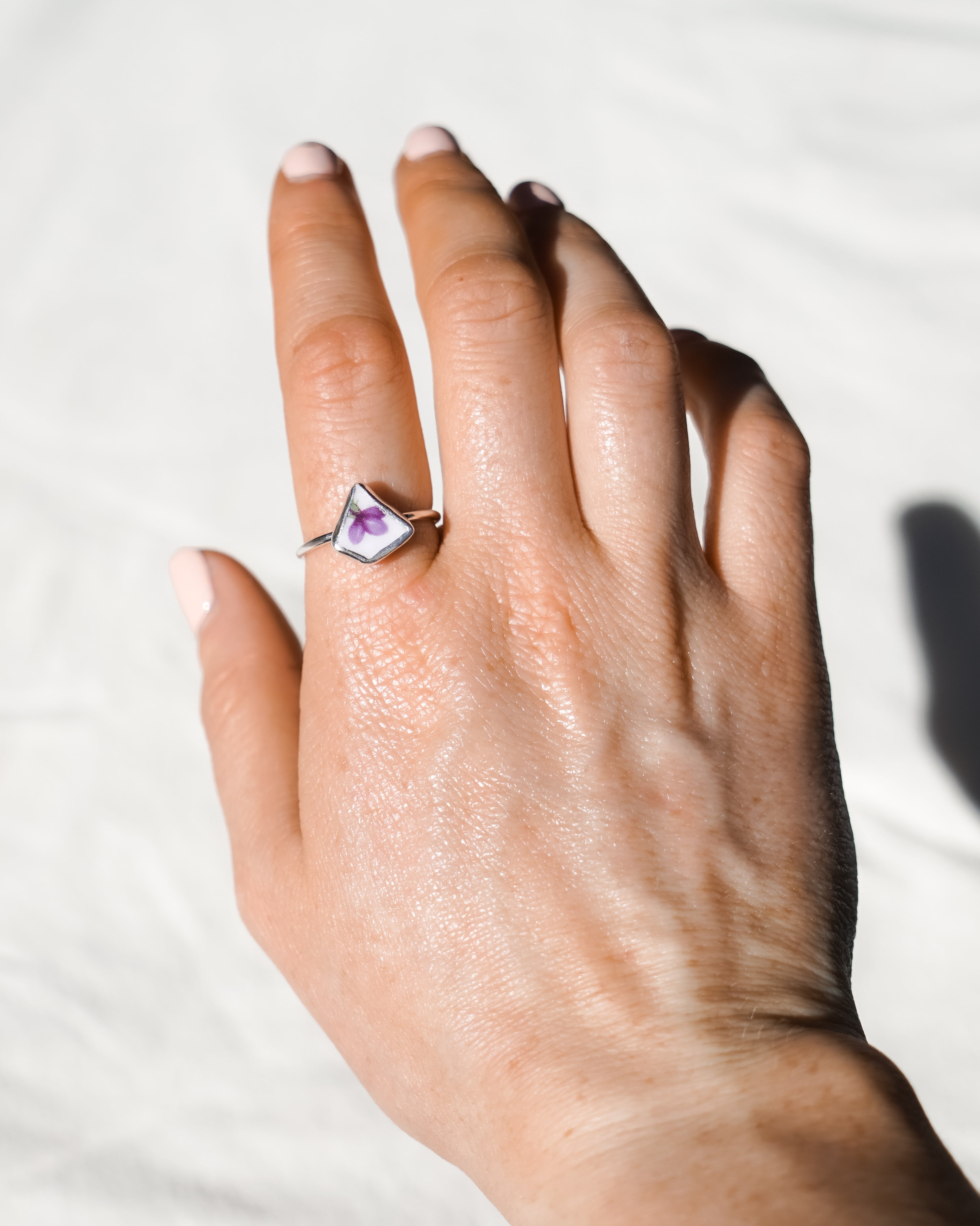 This ring has been made from a fragment of an old plate and turned into the cutest jewellery piece. The little purple flowers have been carefully encased, preserving their charm and beauty. Each piece tells a unique story, combining history and craftsmanship, making it a cherished accessory to be worn and admired for lifetimes to come.