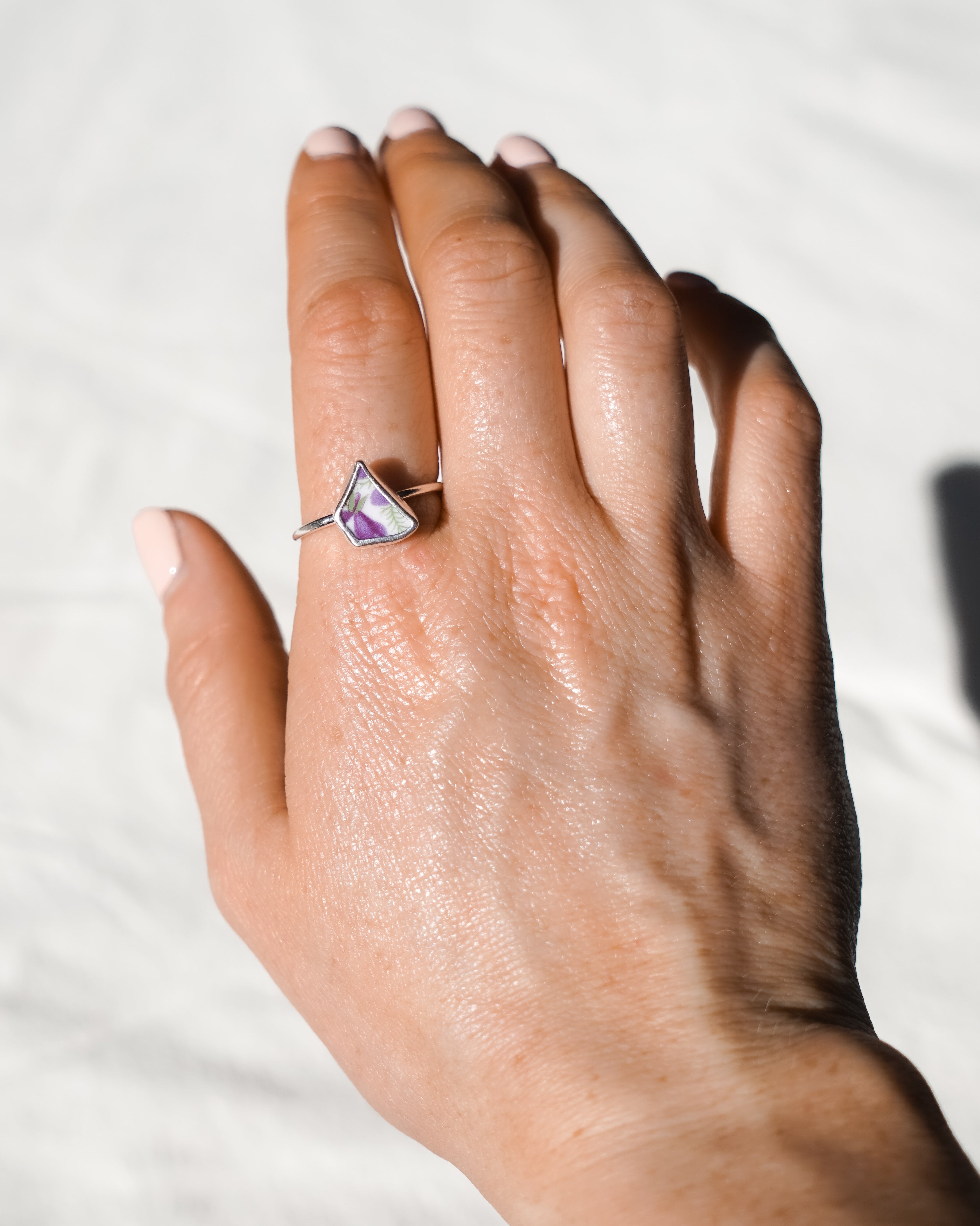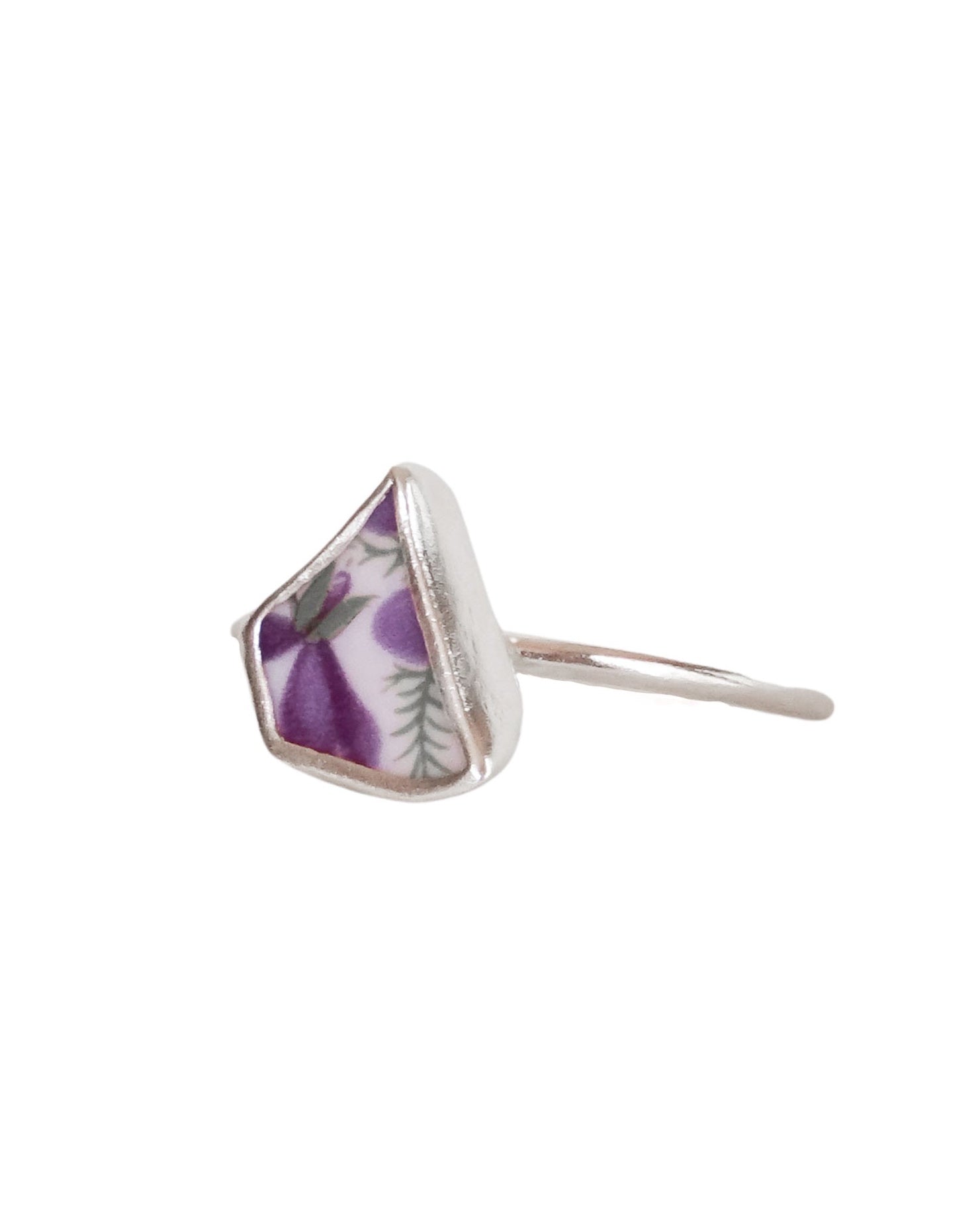 This ring has been made from a fragment of an old plate and turned into the cutest jewellery piece. The little purple flowers have been carefully encased, preserving their charm and beauty. Each piece tells a unique story, combining history and craftsmanship, making it a cherished accessory to be worn and admired for lifetimes to come.