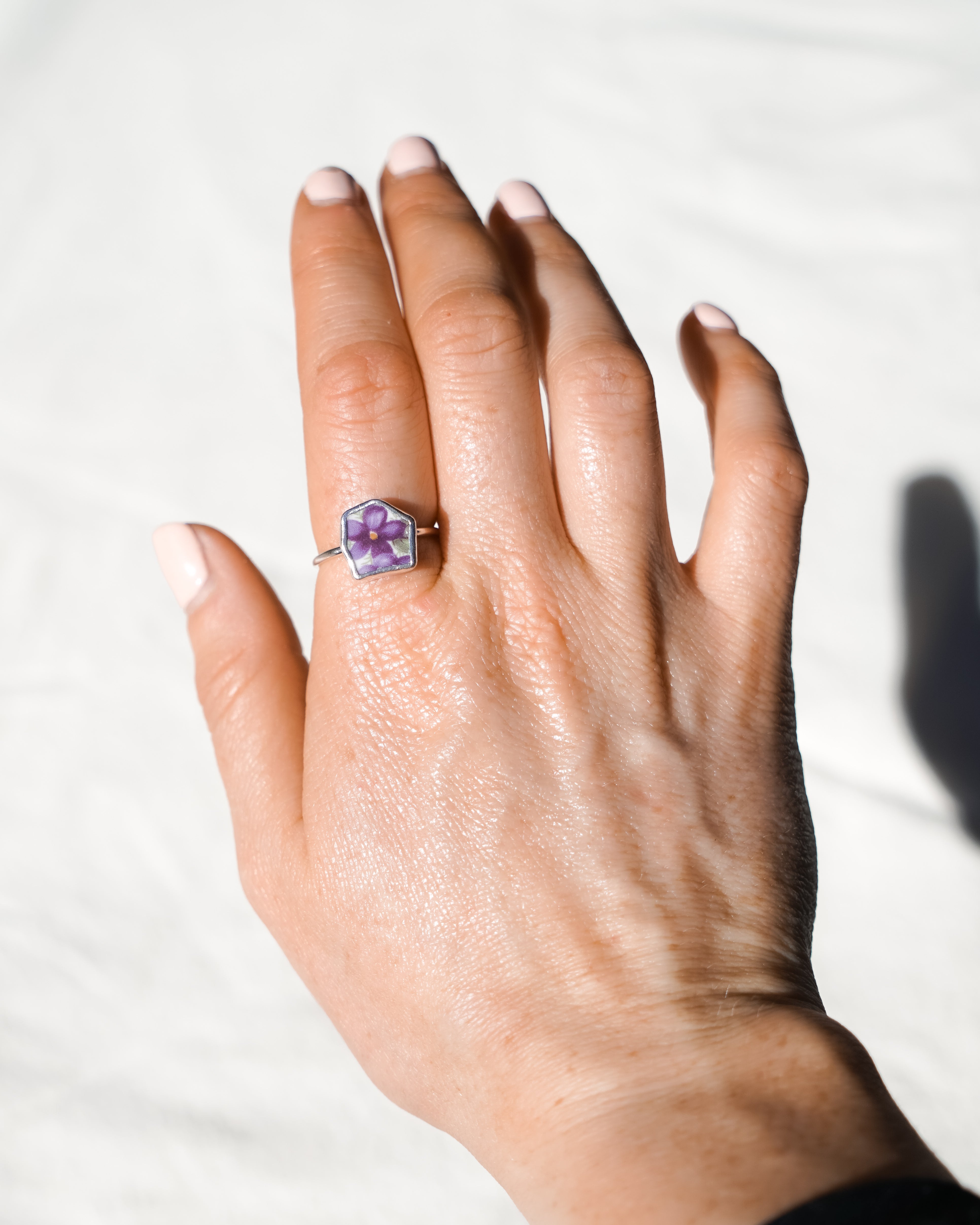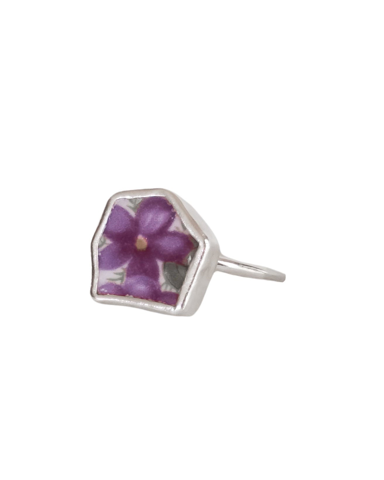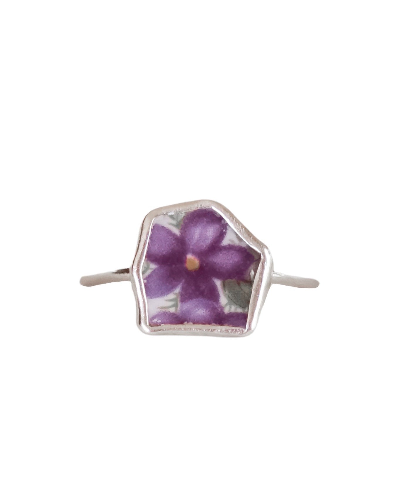 This ring has been made from a fragment of an old plate and turned into the cutest jewellery piece. The little purple flowers have been carefully encased, preserving their charm and beauty. Each piece tells a unique story, combining history and craftsmanship, making it a cherished accessory to be worn and admired for lifetimes to come.