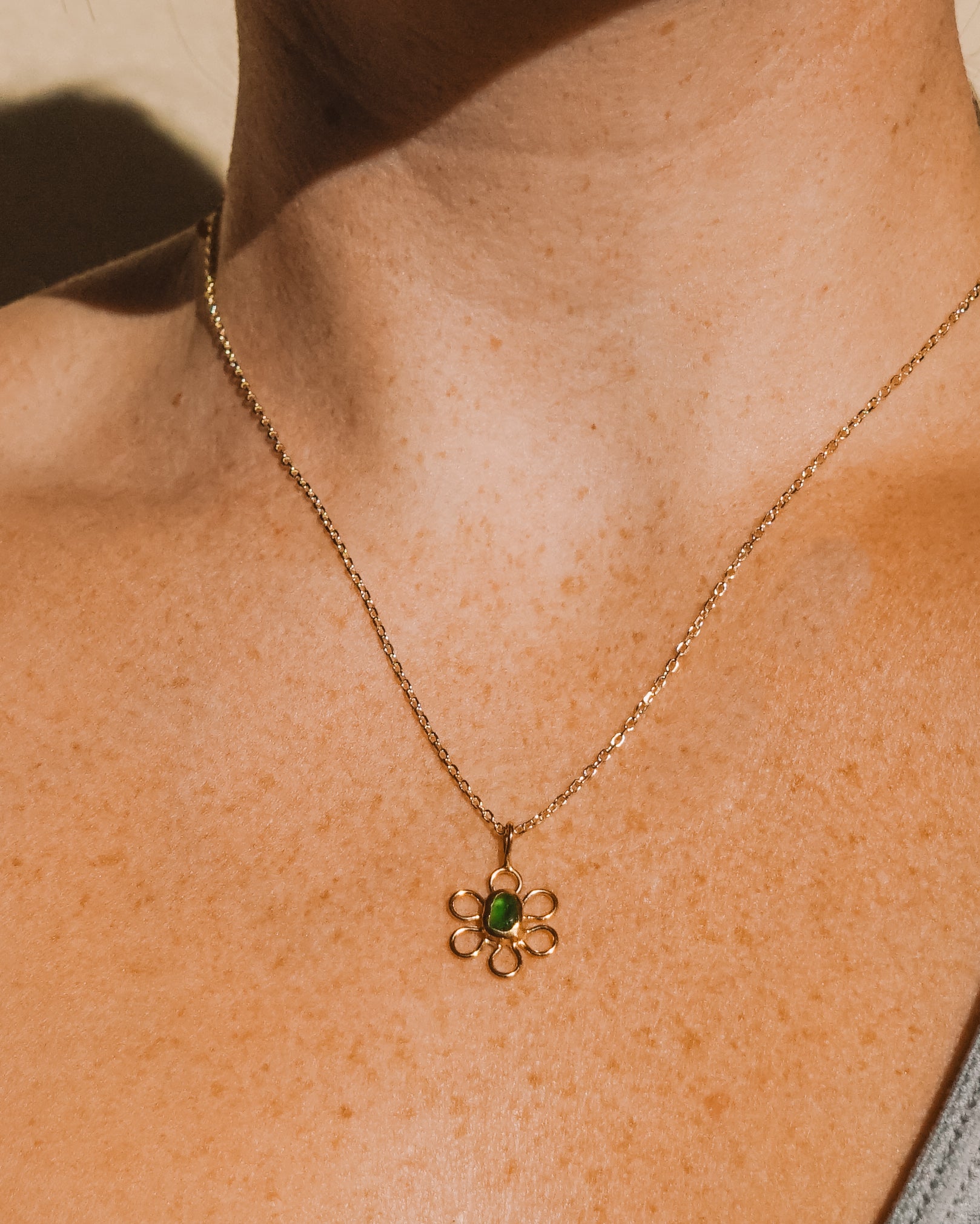 A beautifully minimalist necklace representing a flower, with a piece of sea glass in the centre. Sterling silver wire has been placed around the glass as petals.